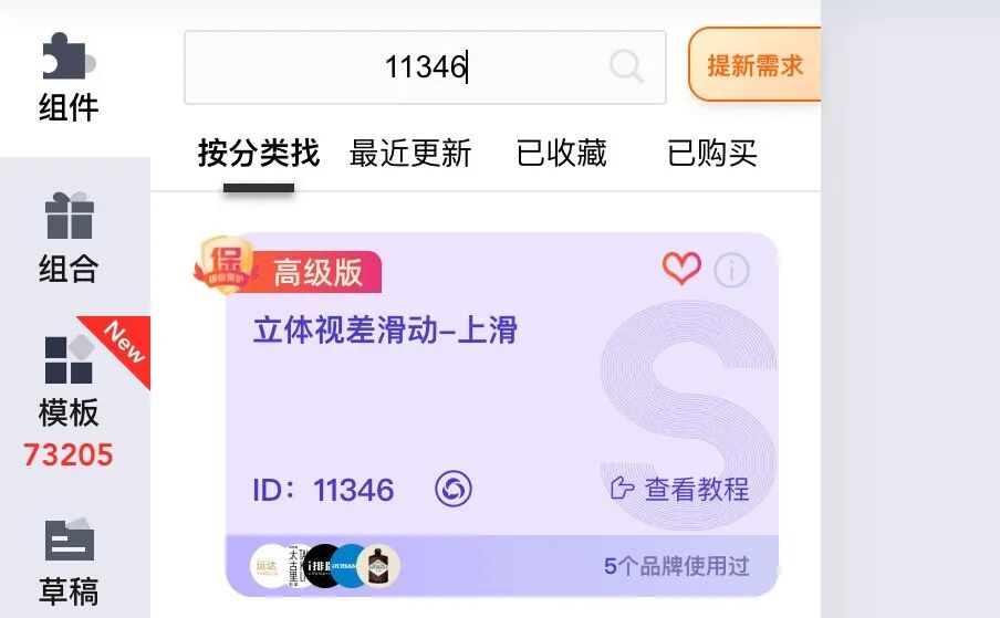 登录 iPaiban Pro 编辑器后,点击编辑器左侧「组件」按钮,在「滑动」分类中找到「立体视差滑动-上滑」组件,或者直接搜索组件编号11346,点击选择。
