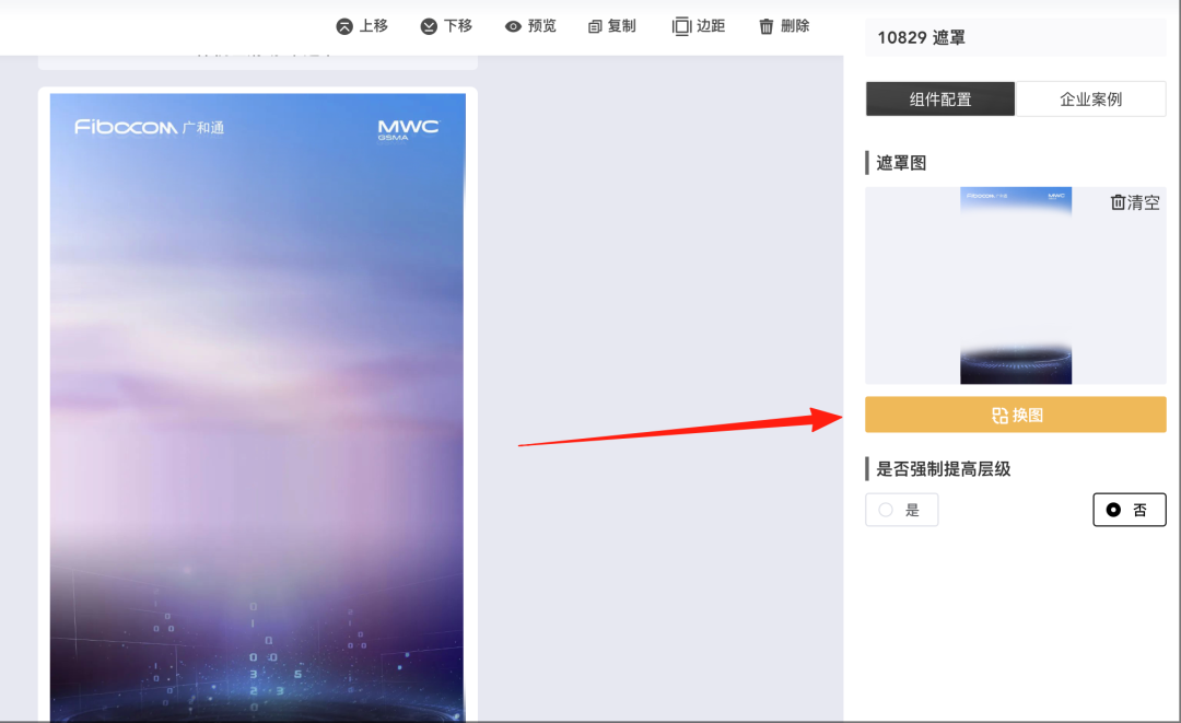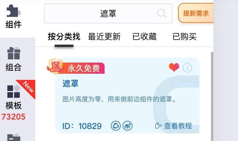 ①点击编辑器左侧「组件」按钮,在「特殊」分类中找到「遮罩」组件,或者直接搜索组件编号10829,点击选择。