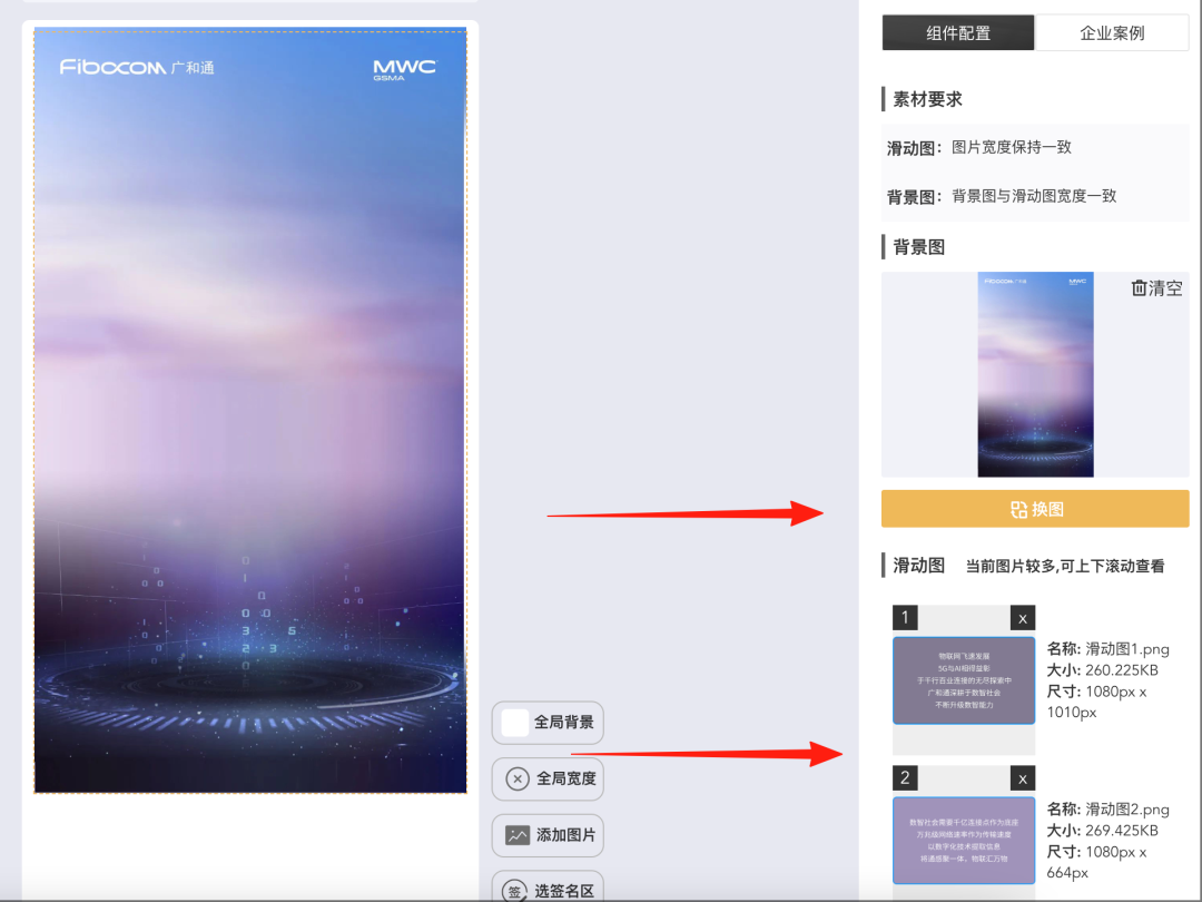 点击右侧「换图」按钮上传单张背景图,点击右侧「+」按钮按顺序批量上传滑动图。滑动图的图片宽度与背景图保持一致。
