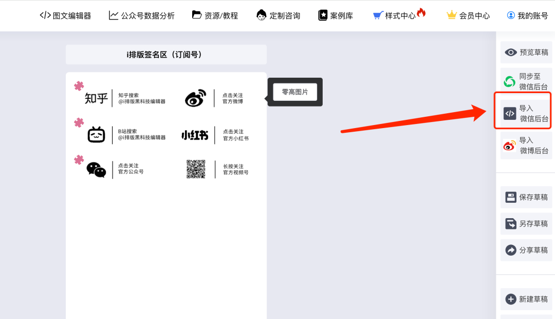 因为微信的限制,SVG内容导入到i排版图文编辑器中可能像下图一样不显示图片,没有关系,导入到公众号后台就能正常显示了。