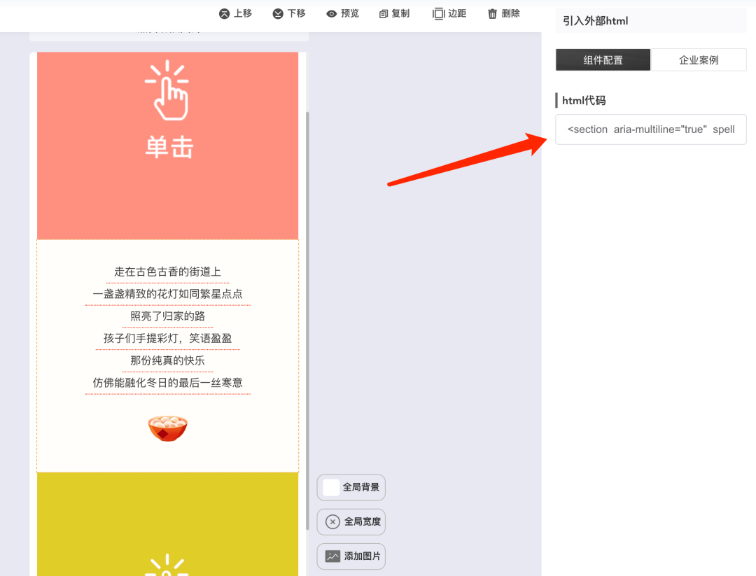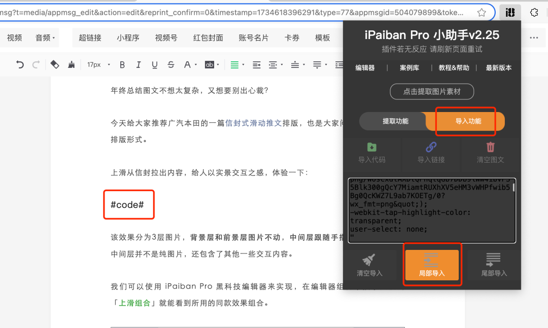 我们先在公众号后台新建文章排好文字部分,然后利用小助手插件的「局部导入」功能导入在 iPaiban Pro 编辑器做好的SVG交互排版,这样就反向实现给交互排版插入文字的需求了。