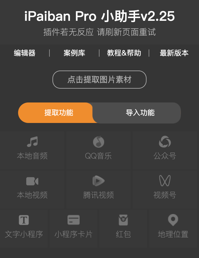 iPaiban Pro 小助手是 iPaiban Pro 黑科技编辑器的辅助工具,主要用来在公众号后台一键提取音频、视频、小程序、公众号和视频号的代码,以及清空图文和导入编辑器生成的图文代码,让排版更高效。