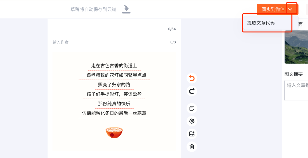 如果想要在两个切换效果之间加入几行样式文字,我们可以先在i排版图文编辑器(网址:https://n.ipaiban.com)中编辑好这段文字,然后右上角点击「提取文章代码」。