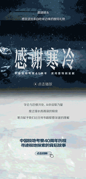 波司登通过「点击后伴随线条轨迹延申」带大家回顾中国极地考察40周年历程,借此宣传波司登品牌大使作为南极体验官参与其中,展现品牌实力与魅力。
