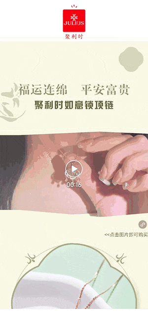 聚利时品牌通过泼天的好运这个热梗,引出能够增加福运的首饰介绍,「点击播放视频」查看详细介绍,吸引更多客户购买。