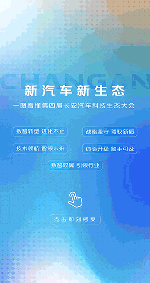 「点击切换」后「自由滑动」带大家查看新汽车新生态,借此宣传长安汽车的各个细节与创意。