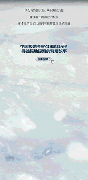 「点击播放SVG轨迹移动动画」依次带大家回顾中国极地考察40周年历程寻迹极地探索背后的故事,借此宣传波司登品牌服装,吸引读者前往购买。