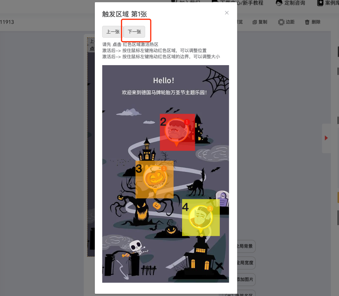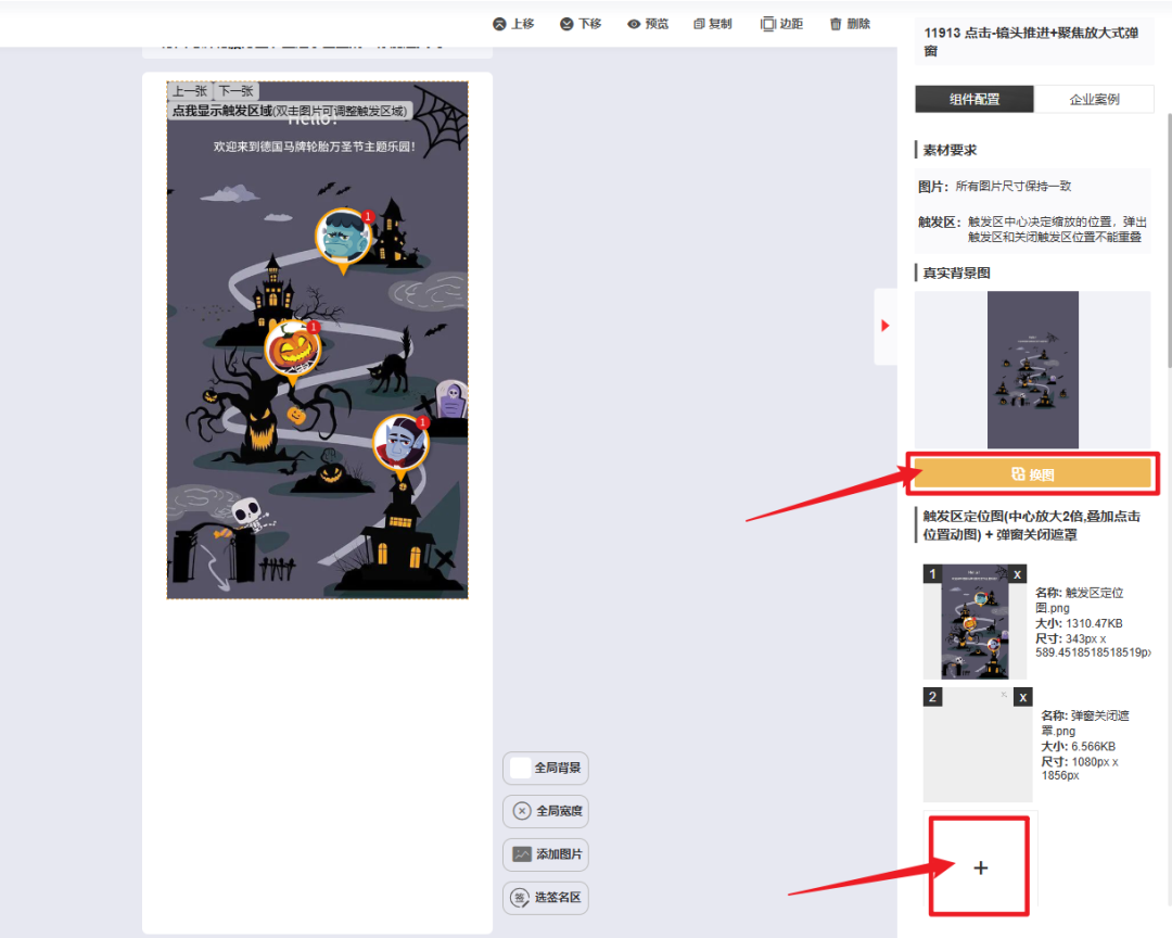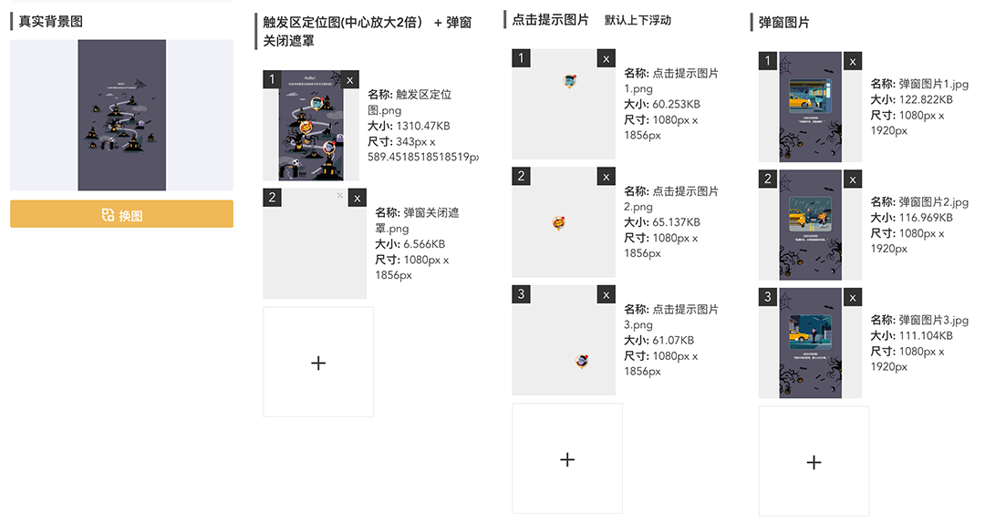 所需图片素材包括四部分,分别为真实背景图、触发区定位图+弹窗关闭遮罩、点击提示图片、弹窗图片。本文案例中的素材上传效果如下: