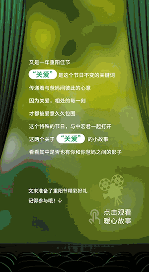 「点击切换后上滑」观看重阳节暖心故事和精彩好礼,然后多个平级「点击展开」不同标题下的故事,借此宣传中宏保险。