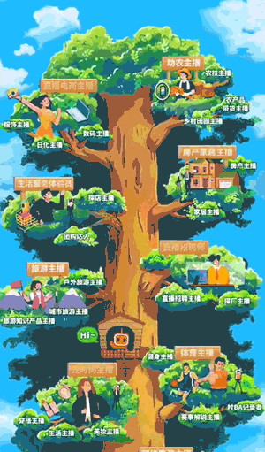 「自动播放序列帧后点击展开」快手主播的介绍,「点击弹窗」查看职业树上的不同主播,借此宣传快手app,吸引读者下载。