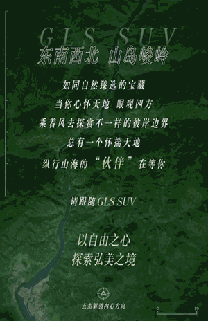 「点击切换」查看藏在心里的越野计划,「点击抽屉式向上切换」东南西北的不同方向代表的风景和GLS SUV汽车的介绍,吸引更多客户购买。