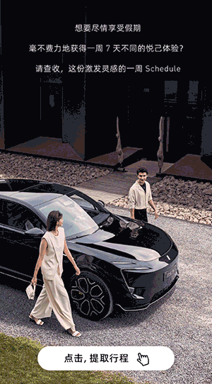 「点击切换后展开」模拟打开悦己的行程,「点击抽屉式切换」查收这份激发灵感的一周 Schedule,借此宣传阿维塔汽车,吸引大家前往试驾。