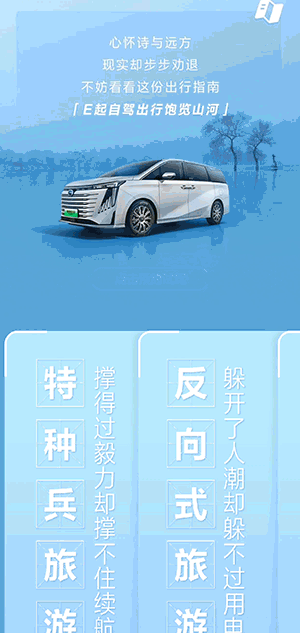 「点击横向展开」国庆出游的汽车介绍,在场景中宣传传祺智电新能源E9汽车,吸引更多客户购买。