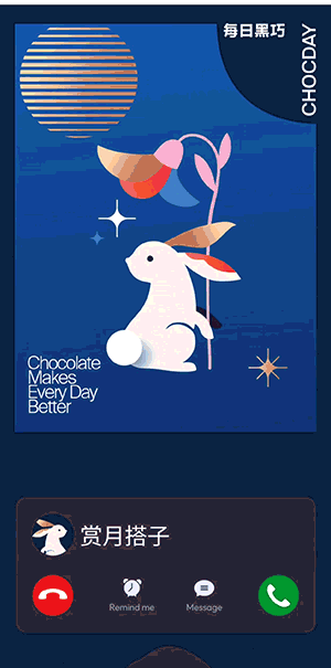 「点击翻转切换」模拟找赏月搭子,借此宣传每日黑巧中秋全家福礼盒,吸引读者前往购买。