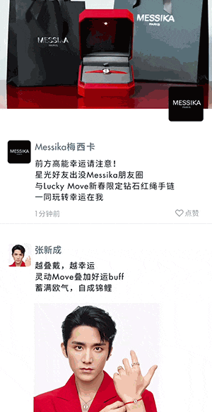Messika梅西卡通过「点击切换后展开」模拟朋友圈的方式介绍Messika梅西卡珠宝,「自动轮播」展示新春限定首饰,借此吸引读者前往购买。