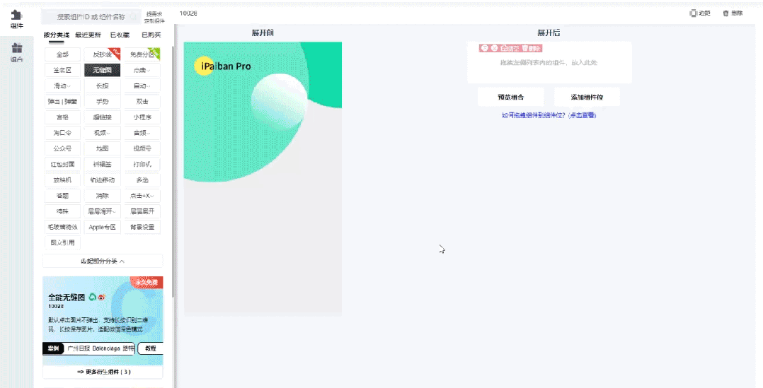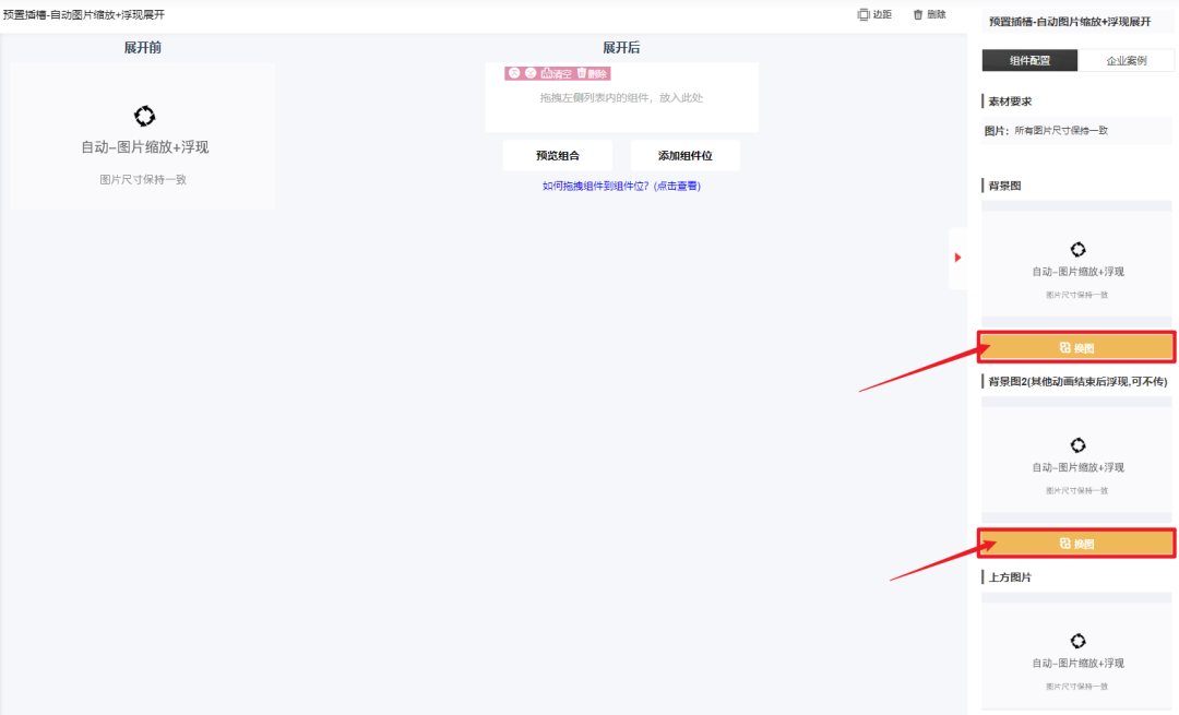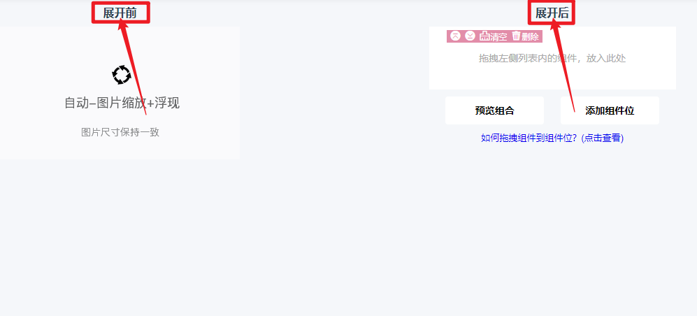 「展开后」的内容支持嵌套各种组件,需要什么效果就在左侧「组件」分类中找到相应的组件拖动到组件位中,然后上传需要的素材即可。
