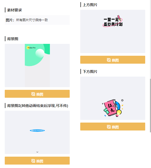点击展开前区域,然后在右侧按照要求点击「换图」依次上传图片。