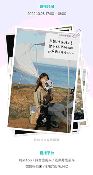 「连续点击飘落」查看剧透,吸引大家「点击播放视频号」查看蔚来汽车的露营直播,借此宣传蔚来汽车,吸引大家购买。