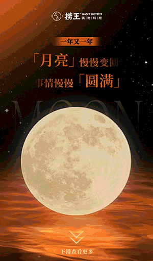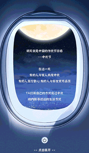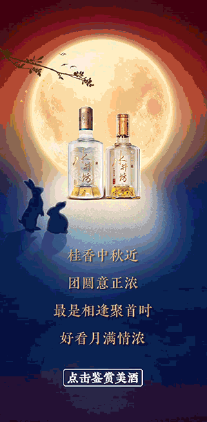 「点击展开伴随月亮移动」展示中秋饮酒的画面,借此宣传和水井高端浓香美酒一起过中秋并吸引更多客户购买。
