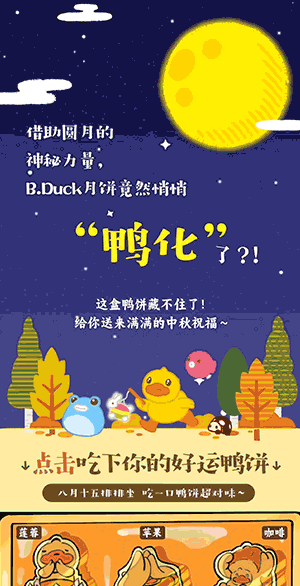 「点击弹性选择展开」模拟吃下好运鸭饼,「点击切换」查看中秋祝福,借此宣传B.Duck小黄鸭×榴芒一刻饼皮月饼。