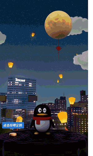 「点击切换GIF并播放音频」模拟给腾讯企鹅喂月饼,伴随喜庆的音乐,企鹅变长并开始舞动,达到很好的娱乐和传播效果,同时向大家送去了中秋祝福。