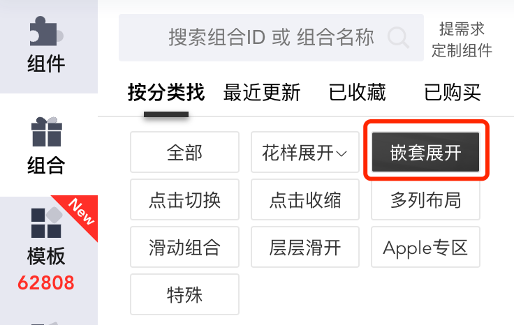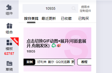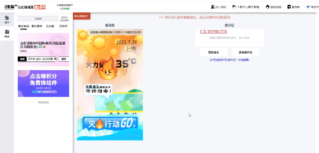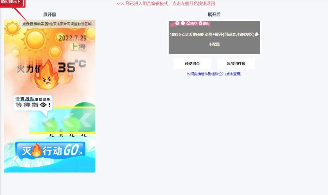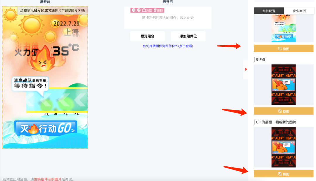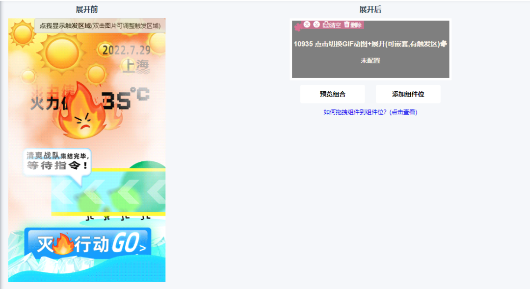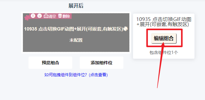 设置展开后的内容,总共分为3步:添加组件位-拖动组件/组合到组件位中-上传素材。