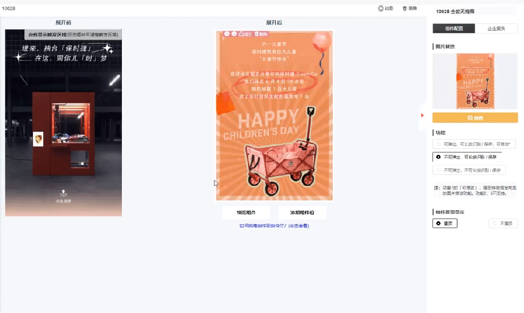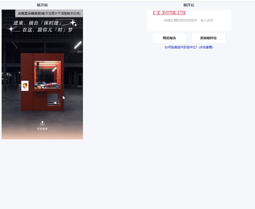 双击「展开前」的编辑区域,会看到一个红色色块,该色块代表了点击展开触发的区域,它的大小和位置可任意调整。