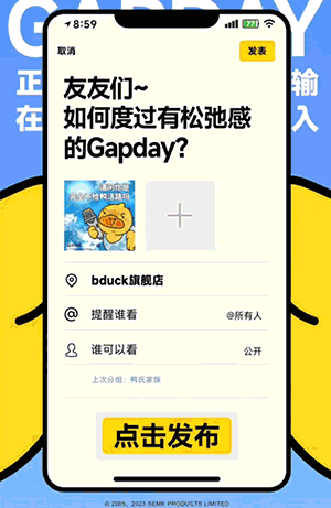 「点击伸缩式展开」模拟朋友圈的方式观看小黄鸭的各个动态,「点击弹出」查看大图,借此宣传小黄鸭B.Duck周边产品,吸引大家前往购买。