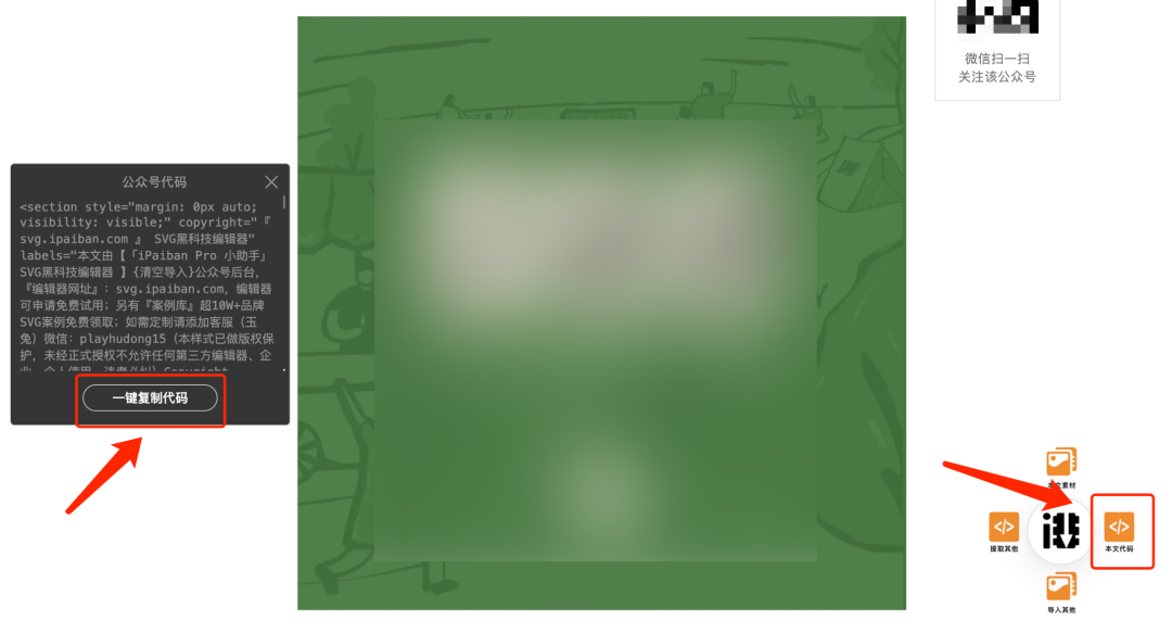 在谷歌浏览器打开发布后的SVG图文,鼠标挪到 iPaiban Pro 小助手插件图标上,点击「本文代码」按钮,在页面左侧就会出现这篇图文的代码。