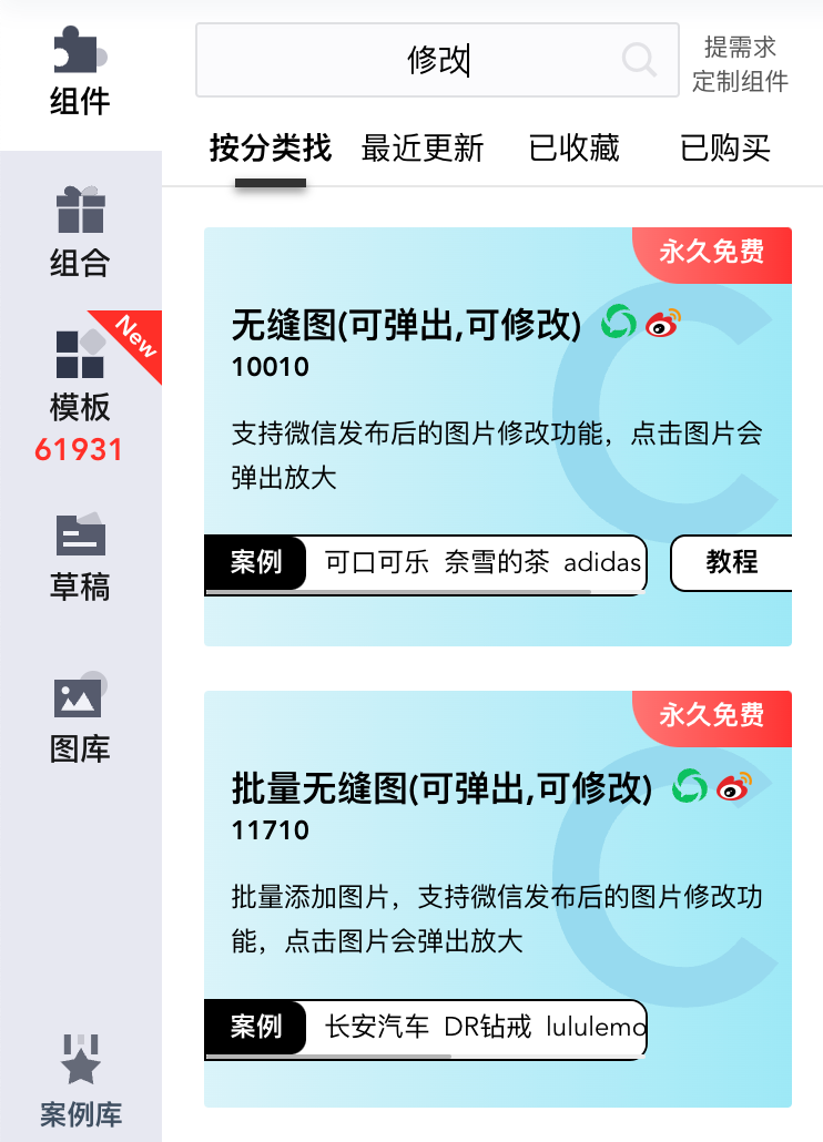 对于非免费且尚未购买的组件/组合,用户通过「免费试用」功能,可直接进行排版并导入微信公众号后台预览测试效果。