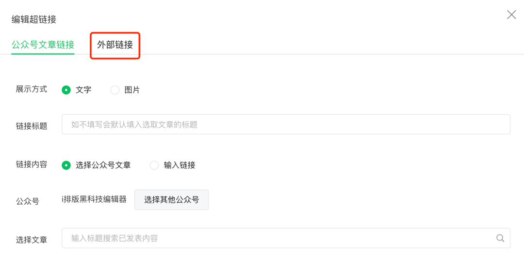 可以这样验证下自己的账号是否有跳转外链的权限:新建一个图文,点击「超链接」,在弹出的窗口中是否有「外部链接」的选项。没有则说明不满足跳转外链条件。