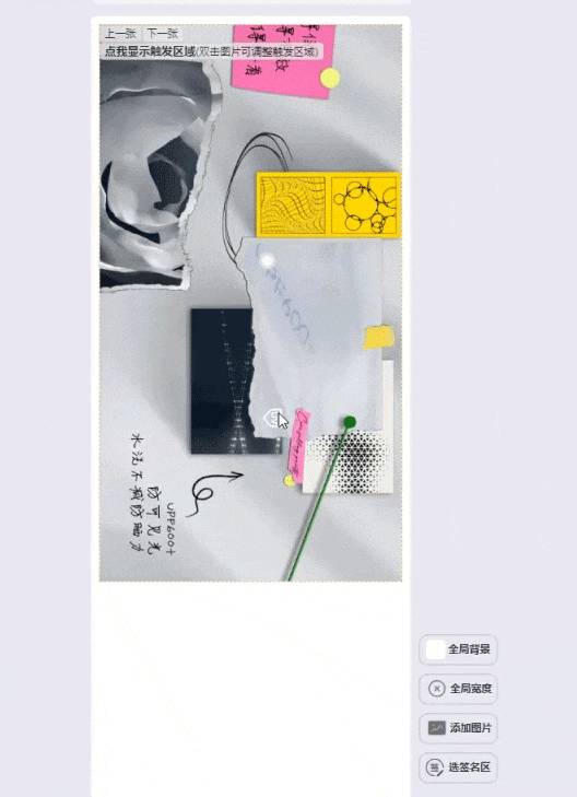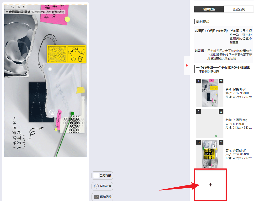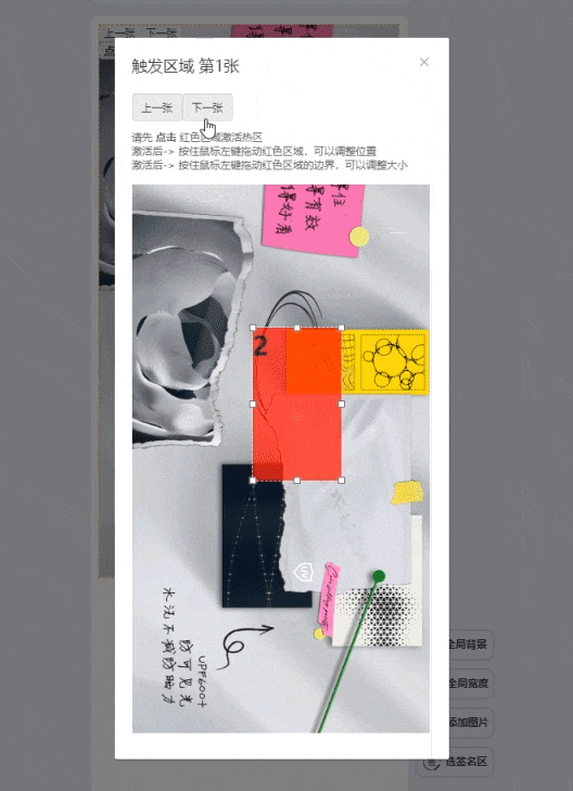 触发区域设置窗口,第一张显示背景图,在背景图上我们要确定的是点击弹出弹窗的触发区域,按倒序拖动色块到指定位置,调整大小即可。