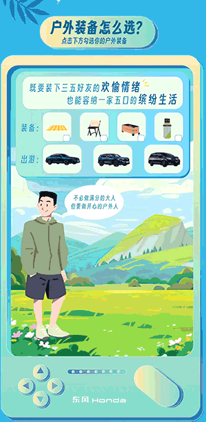 「点击切换」模拟勾选户外装备、职场装备和运动装备,吸引大家互动和传播,借此宣传东风本田。