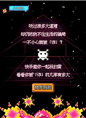 「连续点击切换后点击伸缩式展开」模拟扫雷游戏的方式引出反诈话题,借此介绍快手APP,吸引读者前往下载观看反诈视频。