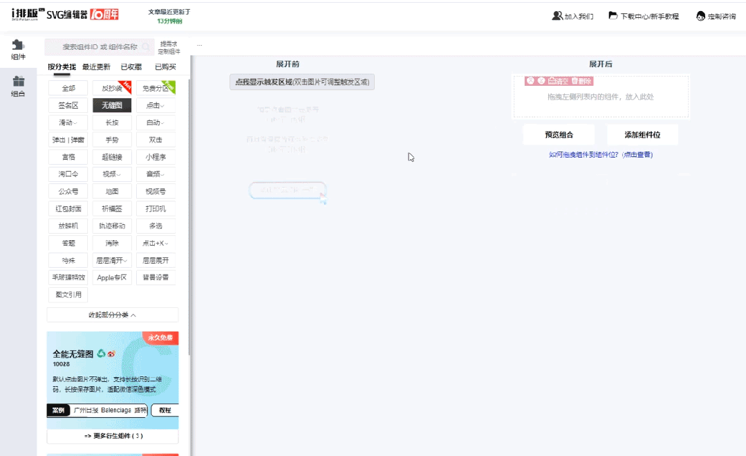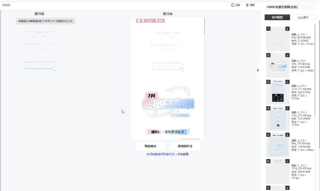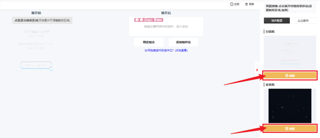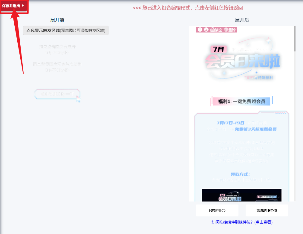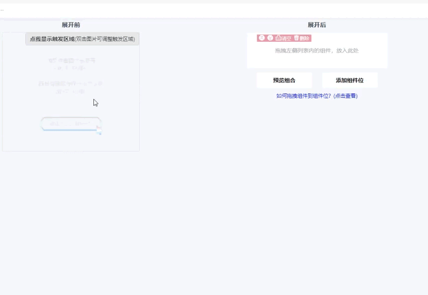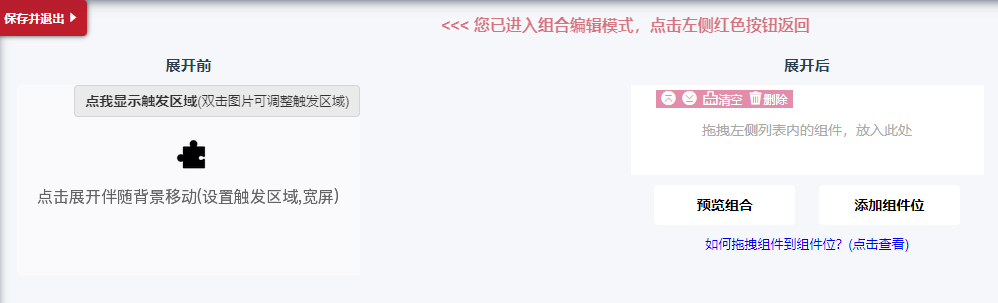 点击编辑区的「点击此处配置」,进入组合编辑模式。在组合编辑模式中,分为「展开前」和「展开后」两个区域。