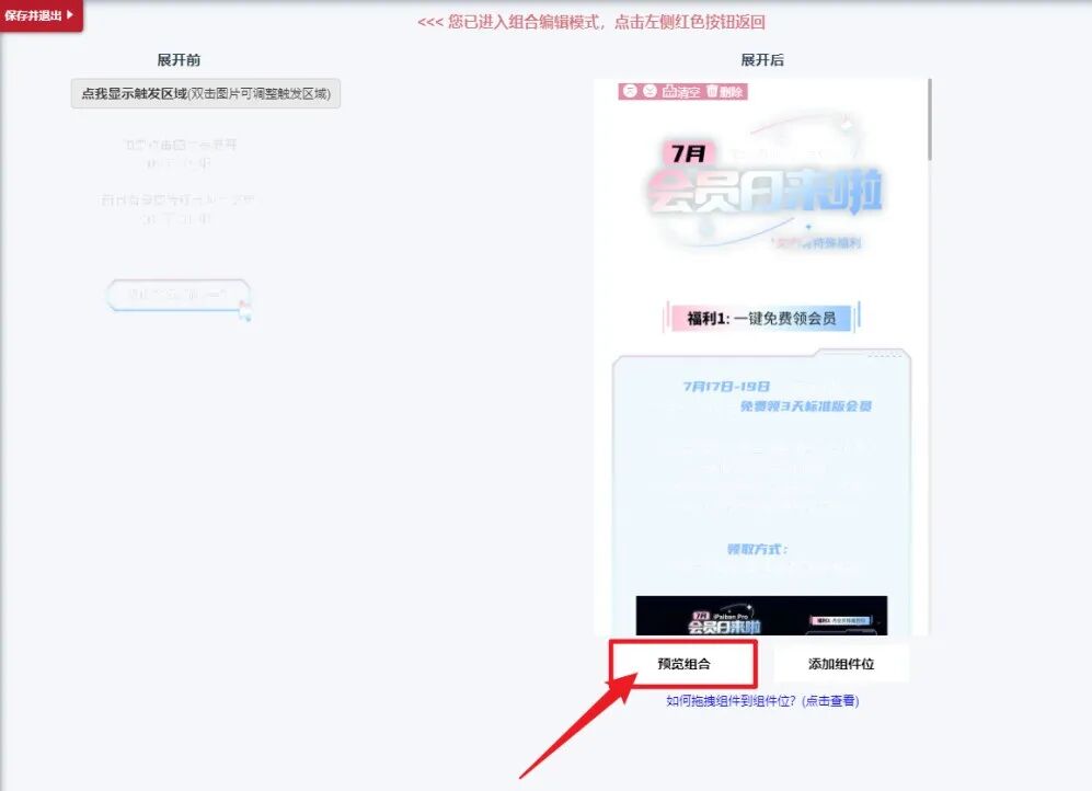 内容编辑完毕后,点击左上角「保存并退出」退出组合编辑模式回到编辑器主页面。