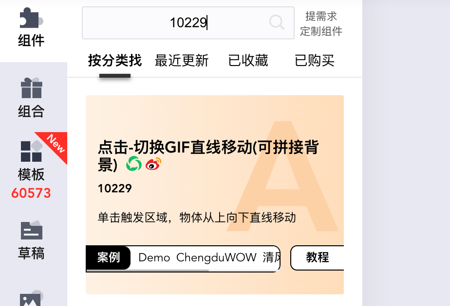 登录 iPaiban Pro 编辑器后,点击编辑器左侧「组件」按钮,在「轨迹移动」分类中找到「点击-切换GIF直线移动(可拼接背景)」组件,或者直接在搜索框中搜索组件编号10229,点击选择。