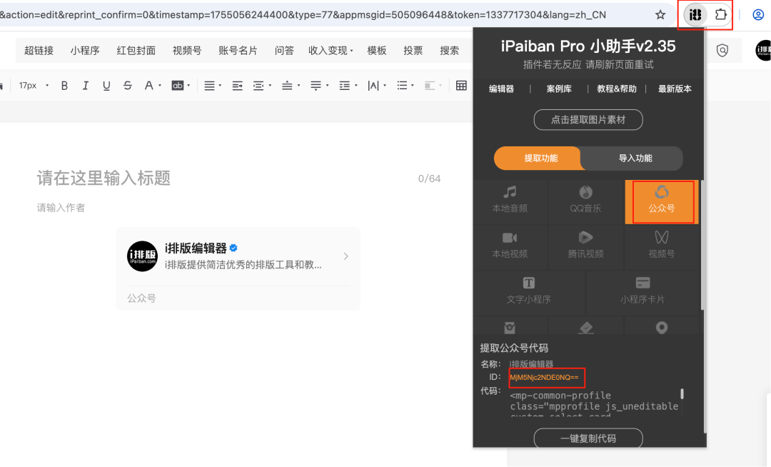 第2步:在页面右上角调出 iPaiban Pro 小助手插件,点击「公众号」按钮即可一键提取出需要的公众号账号ID。