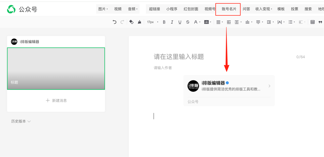 第1步:在公众号后台新建文章,插入公众号账号卡片。