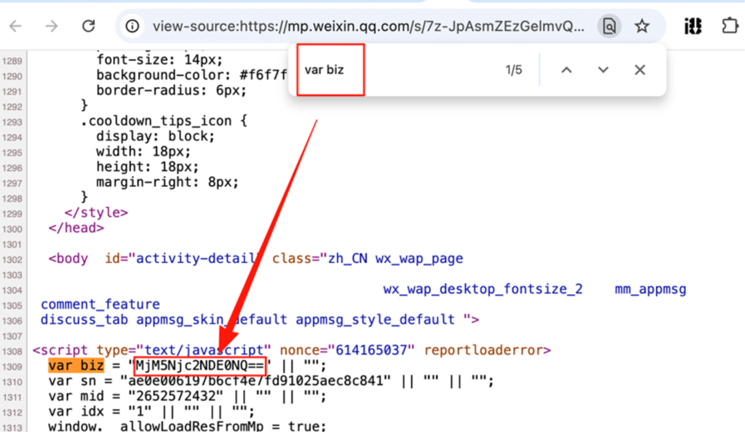 第2步:在打开的代码页面中,按「Ctrl+F」调出搜索框,接着输入「var biz」按回车搜索即可定位公众号ID的位置。