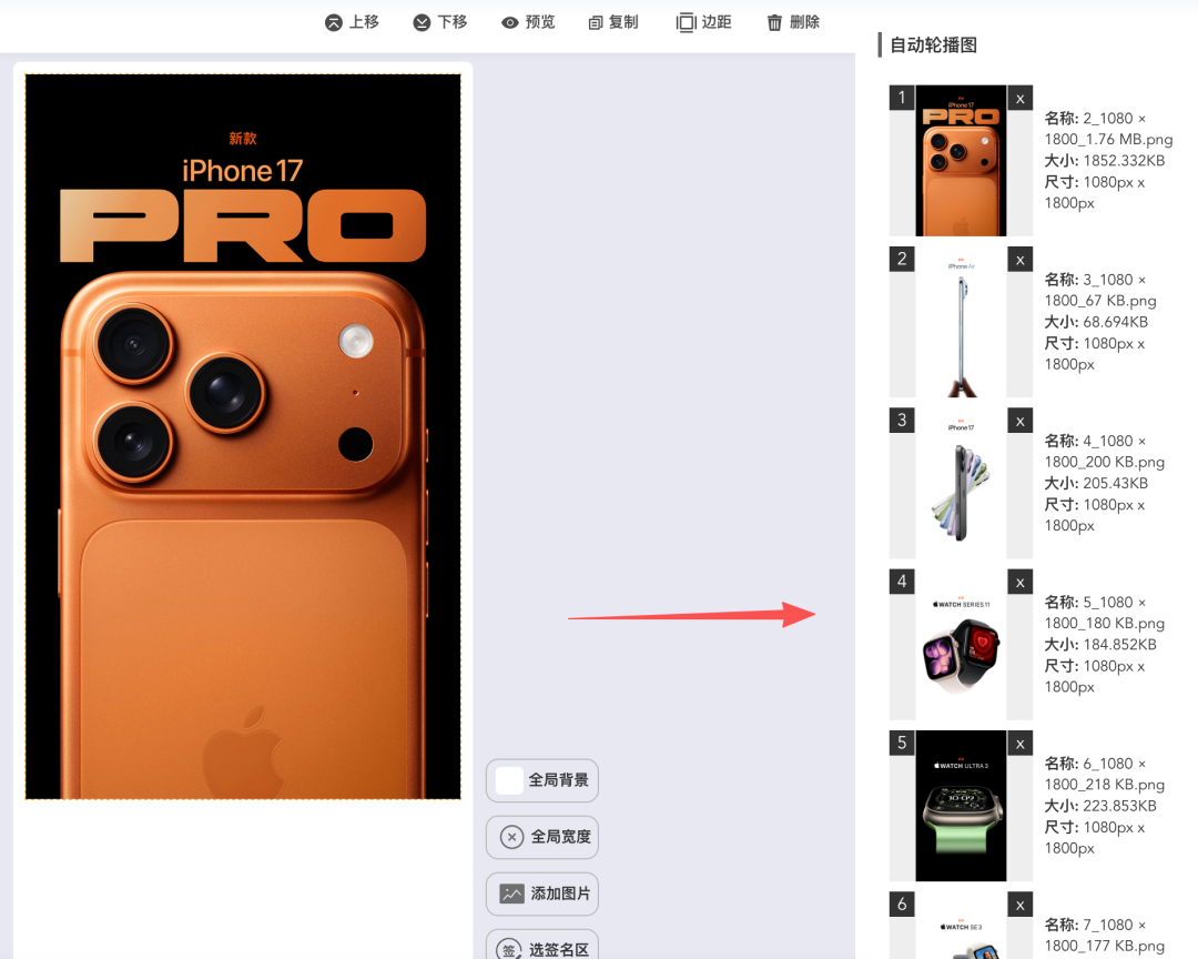 它的排版方式非常简单,在 iPaiban Pro 黑科技编辑器中选择「自动-收缩轮播(中心)」组件(编号:11298),然后上传准备好的素材图就可以,注意素材图尺寸需保持一致。