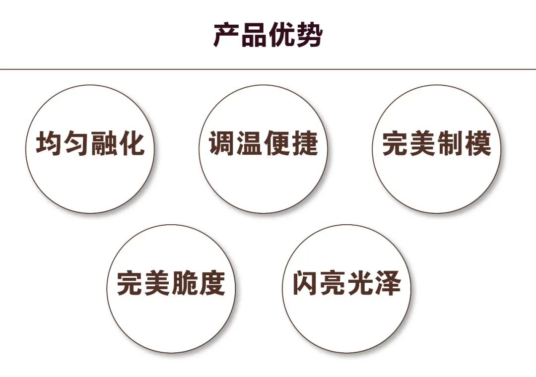 标准的流动性,可广泛应用于各个创作领域,如慕斯、甘纳许、蛋糕、奶油、馅心、冰淇淋和沙司、淋面涂层、模具巧克力等。