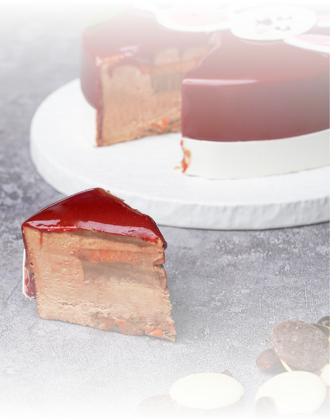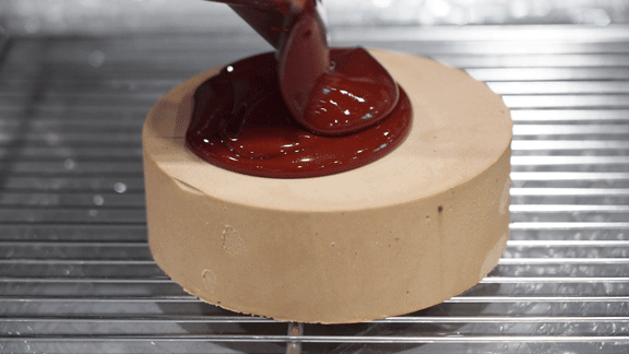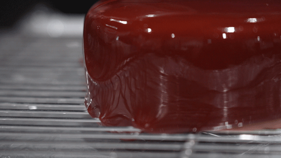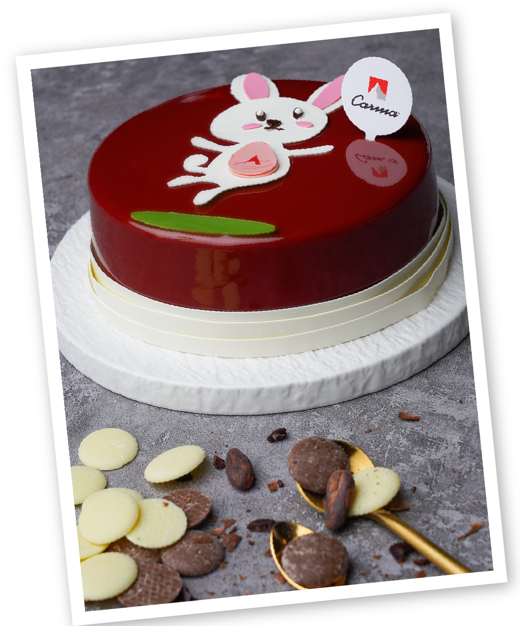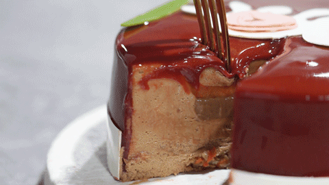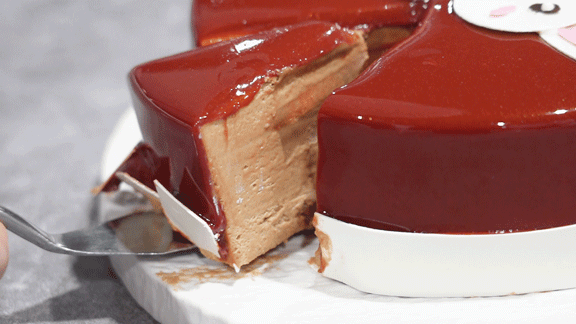 表层运用卡玛牛奶巧克力的稳定性,创造出如同镜面一般有光泽的淋面,又增加了几分食欲。