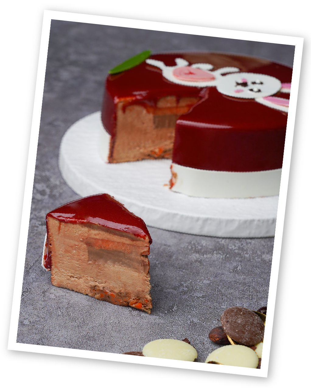 一款低调炸味蕾的巧克力慕斯蛋糕,以松软蛋糕胚以及轻盈慕斯为本体,质地细腻,口味经典又富有新意。俏皮的小兔子,唤醒沉浸在春季中的困乏味蕾,更吸引到目光的停留。