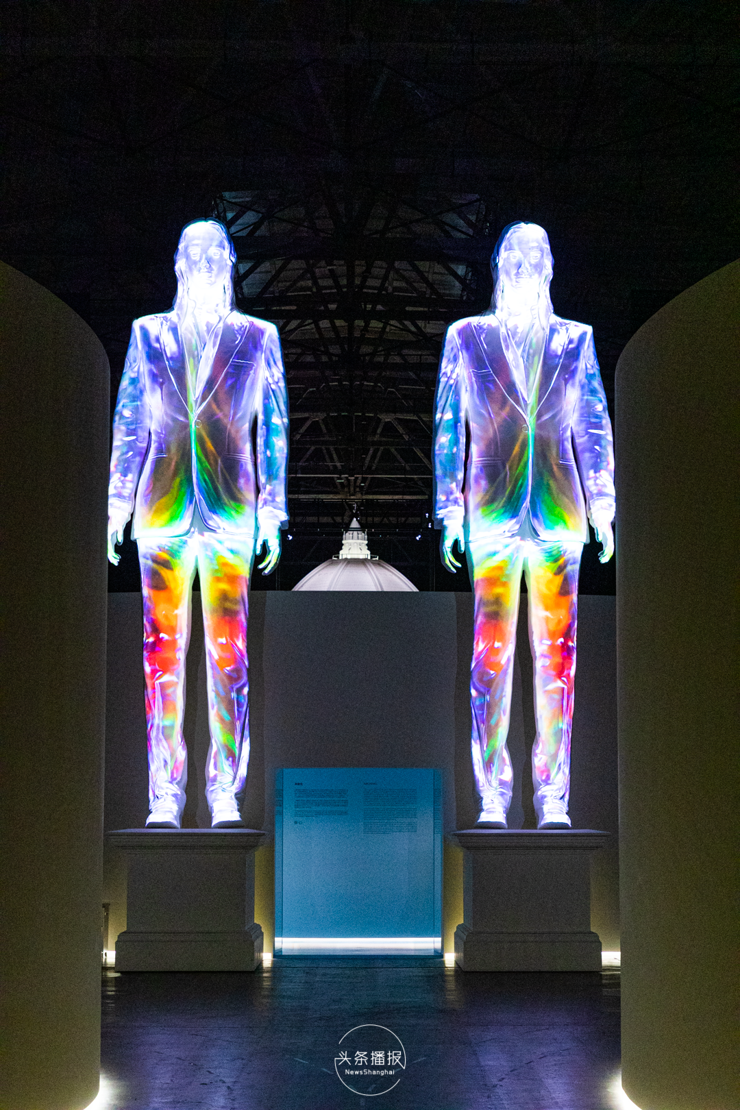 紧接着,强烈的视觉冲击扑面而来,一对高达10米的巨型白色雕像,如同古老神庙的门神般震撼。表面投影出古驰历代标志性套装影像,展现着与众不同的生命力。