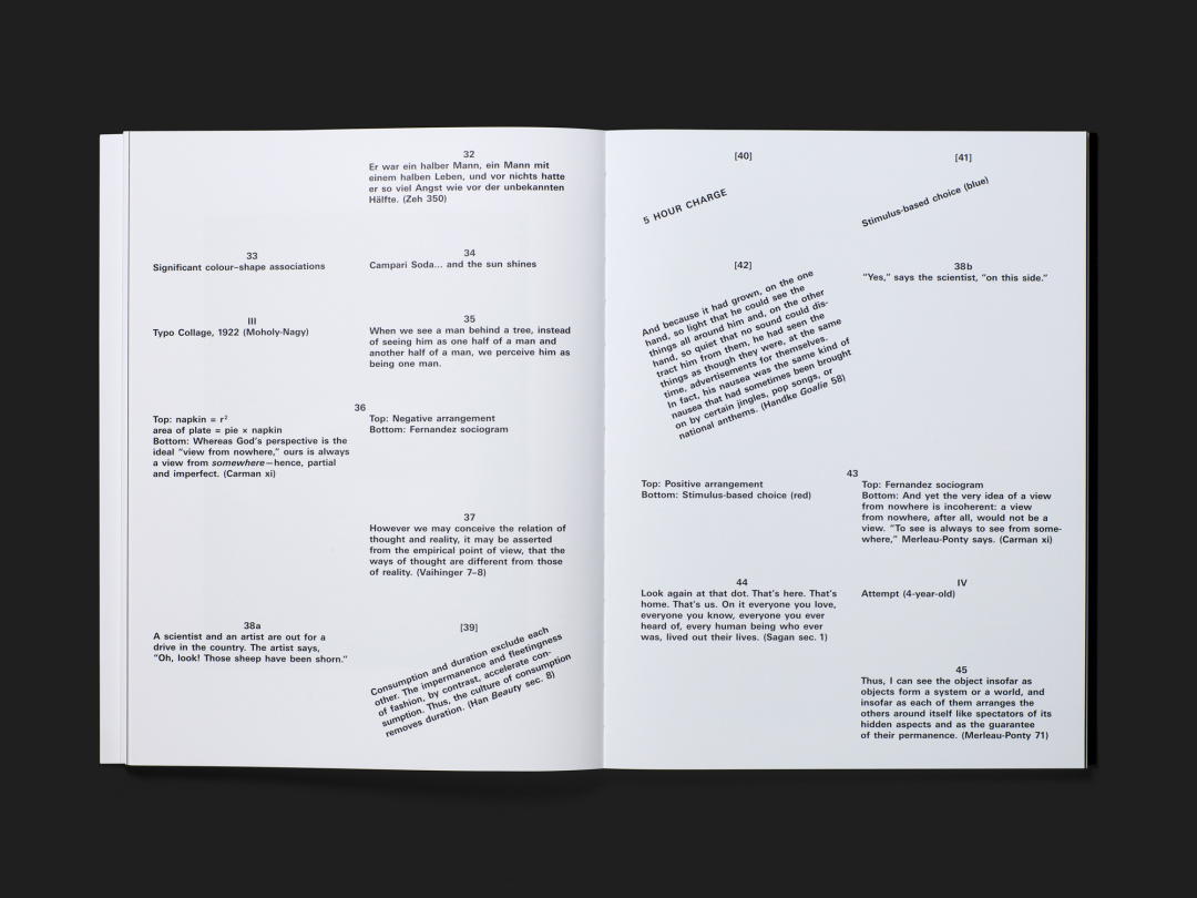书中每十六幅图像后,会出现一个跨页的文字描述,对应前面的作品;有的文字单纯是描述性的,有的则引用哲学著作、感性心理学或广告,还有的就像一个冷笑话。