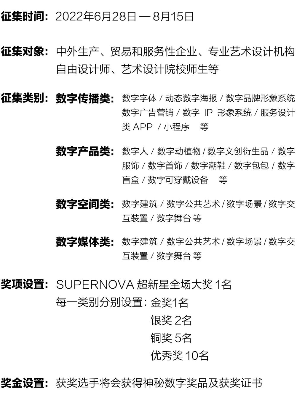 2022年第十届DESIGNNOVA天鹤奖国际创新设计大赛,将聚焦于数字创意领域,从产业角度出发,征集作品涵盖数字传播类、数字产品类、数字空间类以及数字媒体类四大类别。参赛选手可根据对应的类别分别投稿。征稿时间于2022年6月28日正式启动,截止时间为2022年8月15日;2022年8月下旬大赛组委会组织国际国内专家评委进行初审、终审,于9月中旬发布获奖名单,并将于9月底举办线上线下获奖作品展。诚挚邀请海内外设计机构、院校师生、独立设计师、中外生产、贸易和服务性企业参赛!
