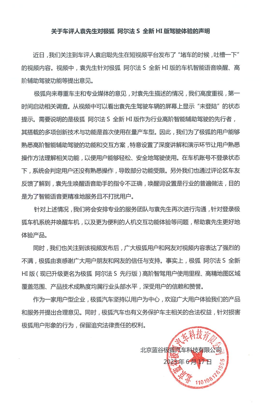 摘要:关于车评人袁先生对极狐 阿尔法S 全新HI版驾驶体验的声明