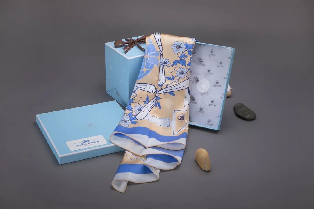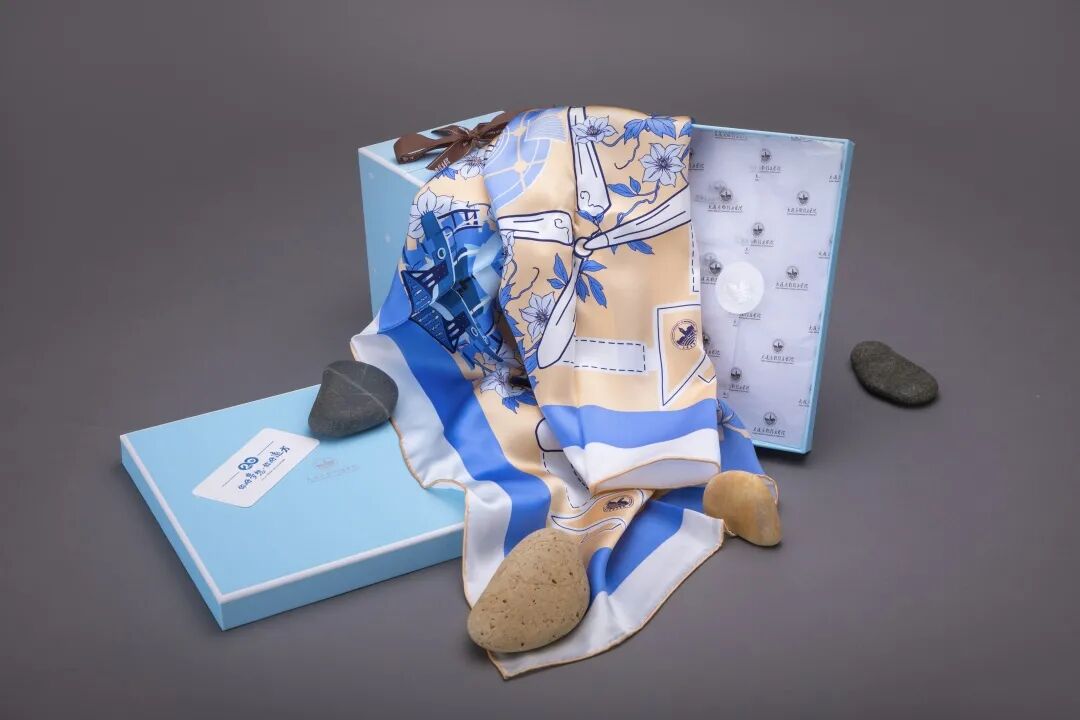 以“东软校园风光”为创意灵感,于美丽的校园中,在典雅的教学楼的映衬下,上游0057号列车从迎春花的花海中缓缓驶来,联动齿轮将这曼妙的景色串联在一起,让象征着蓬勃朝气的时钟熠熠生辉。以金为底,以蓝为点缀,经过重新组合着色铺展丝巾之上,在唯美飘逸的端庄秀雅里,在精致丝滑的轻柔美韵中,丝缕之间,方寸之外,我们共同的梦想绵绵蔓延开来。