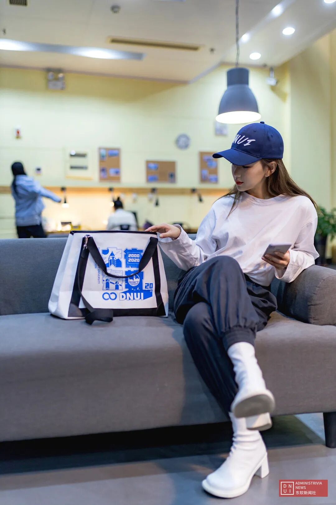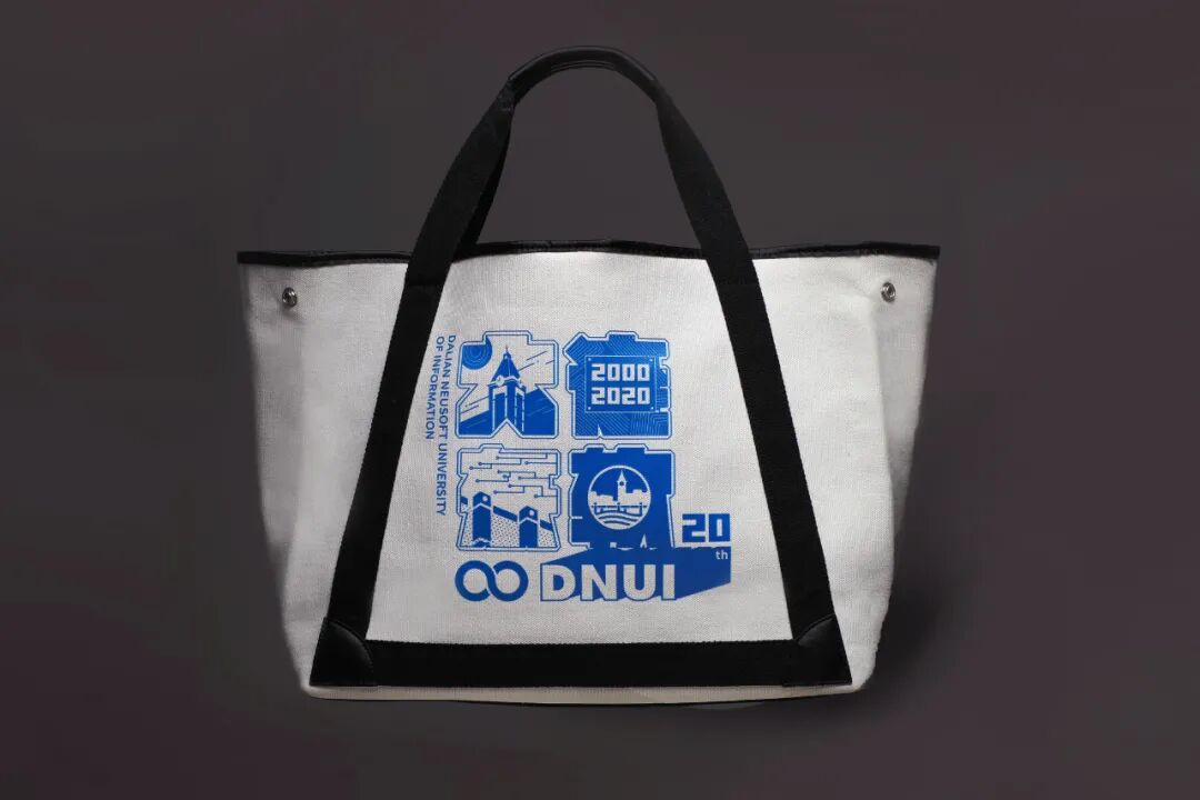图案以东软蓝为主要颜色基调,以矢量化的设计构筑整体造型。宏观通过“大连东软”和“DNUI”的文字轮廓勾勒出整体形态,微观上融入了大东软建筑、校徽、时间和建校20周年的相关元素,整体风格简洁自然。无限符号和20th是大连东软信息学院建校20周年的相关元素,寓意大东软“无限可能的未来”。
